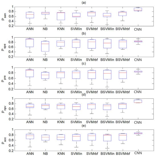 ANN represents a three-layer artificial neural network based on MLP. Each participant repeats the training and testing process of the neural network for 10 times, calculates its average value for comparison and statistical analysis, and sets the number of hidden neurons and input feature dimensions to 55. NB represents a naive Bayesian classifier without any pre-set parameters. KNN means K-nearest neighbor classifier with K = 30. and represent standard support vector machines using linear and nonlinear kernels with radial basis functions (RBFs), respectively. For linear support vector machines, the model selection of regularization parameters can be obtained with a training set, a validation set and 15 candidate parameter sets composed of {}. For RBF-SVM, grid search regularization parameters and kernel width are used in the set {}. BSVM indicates that the bounded support vector machine is a variant of the standard SVM. Similar to the implementation of the standard support vector machine, the linear kernel and RBF kernel use the same model selection criteria, respectively, which are represented as and . It can be found from Figure 7 that among all classifiers of , and , the median of CNN model is the highest, while the median of the neural network classifier is the highest. Table 3 lists the results of comparing the five performance indicators between the CNN model and the other seven MP classifiers with Wilcoxon signed rank test. It shows that , and have been significantly improved, and the values of and are equivalent to the performance of other classifiers.