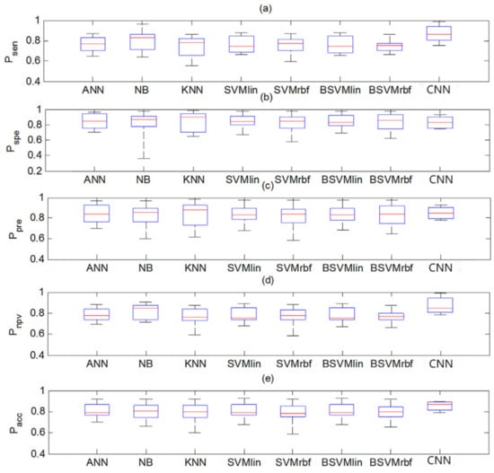 Boxplot of cross-session MP classification performance indices for different classifiers. (a–e) represent the performance of and , respectively.