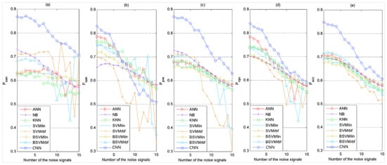 The results show that the classification performance will decrease with the increase in the noise number of all classifiers. From the Figure 9e, it can be observed that the CNN classification algorithm based on TL achieves higher overall classification accuracy () than the other seven classification methods under all noise conditions. Thanks to the specially designed hierarchical structure, the CNN classification algorithm based on TL owns better noise robustness. For the performance index of single class classification, the CNN classification algorithm based on TL is shown to have superiority to other classifiers of , and under all noise conditions. As the number of noise signals increases, the classification rate of high MP class (i.e., ) decreases significantly, see Figure 9b. When EEG features are seriously polluted, this degradation will weaken the corresponding overall classification accuracy.