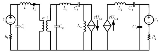 In this paper, we first establish the independent mathematical model of each module converter separately to obtain the equivalent circuit model. By cascading the circuit models of each level, we obtain the equivalent circuit model of the cascaded converter system so that we can establish the mathematical model of the cascaded converter system based on this circuit model. According to the buck/boost converter mathematical model and the CLLLC converter mathematical model, the steady-state equivalent circuit diagram of the buck/boost + CLLLC converter cascaded system can be obtained, as shown in Figure 6.