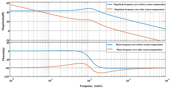 Figure 7 shows the Bode diagram of the controlled object of the voltage loop. The system gain in the low-frequency band is small and the slope is 0. The dynamic performance of the system is poor and there are steady-state errors, so a PI controller needs to be introduced to increase the gain of the system in the low-frequency band and increase the slope of descent. After system compensation, the system has a low-frequency slope of 20 dB/dec, a cutoff frequency of 100 Hz, and a phase margin of 120°, which is in line with the design criteria, and the PI controller parameters are reasonably designed.