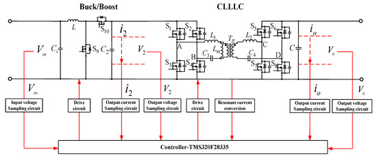 To solve these problems, this paper proposes a bi-directional buck/boost + CLLLC cascade structure [19,20]. By controlling the CLLLC converter to operate near the resonant frequency point, it exhibits the characteristics of a DC transformer, providing only electrical isolation and voltage matching, while the buck/boost converter controls the output voltage of each module. The system adopts a three-loop control strategy, and both the CLLLC converter and the buck/boost converter adopt dual closed-loop control. A voltage-sharing loop has been added to the buck/boost converter to achieve system input voltage sharing [21,22,23,24]. This design ensures the conversion efficiency of the resonant converter, as well as its good soft switching and dynamic characteristics. Compared to other topology structures mentioned, the advantages of a multi-converter combination system can be summarized: (1) reducing the power of submodules, facilitating device selection, and reducing costs. (2) The series-parallel structure of multiple converters facilitates system expansion and maintenance, while also improving system redundancy. Finally, the correctness and effectiveness of the parameter design and control method were verified through a 1 kw experimental prototype.