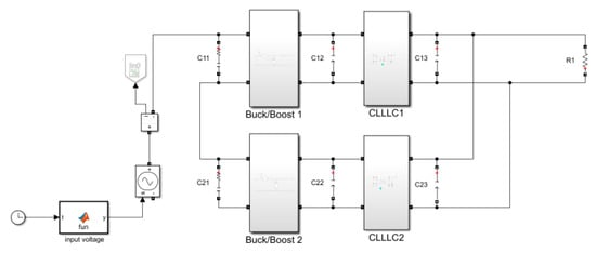 In order to verify the correct parameter design, dynamic performance, and stability of the proposed control strategy of the system, an ISOP system with two identical module parameters was built based on Matlab/Simulink to simulate load and input voltage sudden changes [33]. The simulation results verify that the system can naturally achieve voltage and current sharing of the intermediate bus under different load conditions. When the input voltage suddenly changes, the voltage of the intermediate busbar and the system output voltage change very little, and have a fast adjustment speed, achieving a good dynamic voltage-sharing effect.
