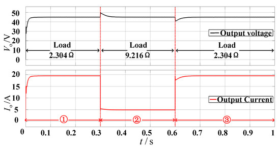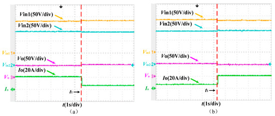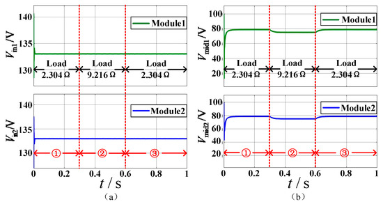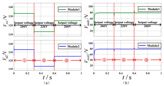 Defined ① in Figure 13, Figure 14 and Figure 15 as a load of 2.304 Ω, ② load is 9.216 Ω, ③ load is 2.304 Ω. Figure 13a,b show the waveforms of the input voltage and intermediate voltage of each module when the system output load changes suddenly at full load and light load. The simulation results verify that each module can achieve equal input voltage distribution and a reasonable selection of control parameters.
