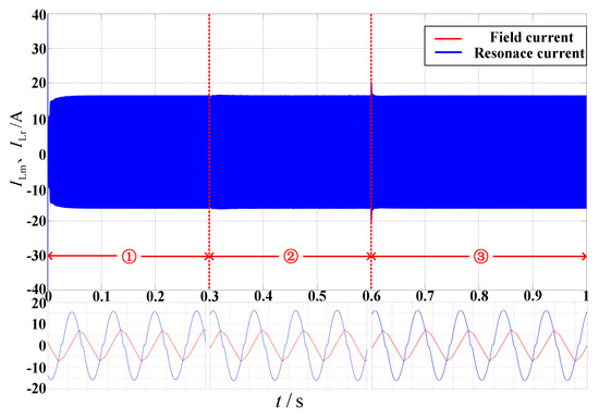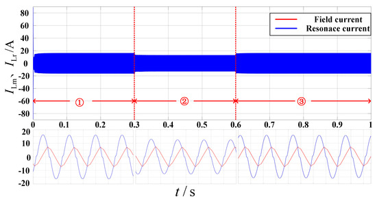 Figure 15 shows the current waveform of the module resonant network. The simulation results show that changes in load can also cause changes in the current value of the resonant network. This is because the resonant current decreases under light load conditions, and the efficiency of the converter slightly decreases. However, under full load conditions, it can be seen that the CLLLC converter operates near the optimal operating point. Whether under light load or full load, the peak current of the excitation inductance remains basically unchanged, indicating that the conditions for achieving the ZVS of the switch under different loads are the same, which verifies the effectiveness of the resonant parameter design.