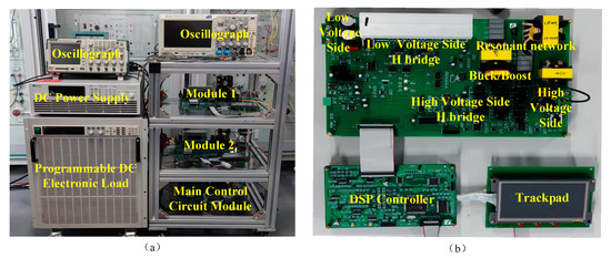 The experimental results show that under the three-loop control strategy, it can respond quickly no matter when the load and voltage suddenly change. The CLLLC and buck/boost converter parameters are designed to use these submodules to form a buck ISOP system. We built an experimental platform based on the design parameters and conducted experimental analysis on the transient and steady-state characteristics of the ISOP system composed of submodules and multiple modules. The experimental platform and submodule physical platform are shown in Figure 19a,b.