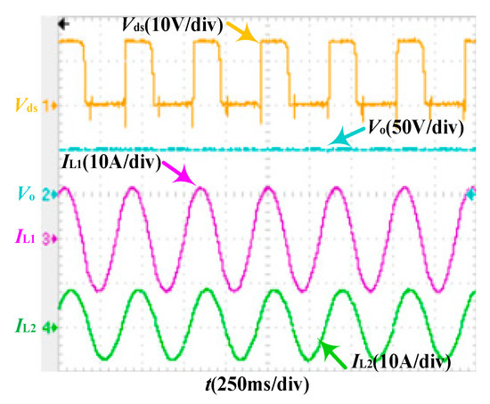 In order to make the ISOP system automatically achieve intermediate bus voltage equalization, the key is to ensure that the CLLLC converter presents DC transformer characteristics, and the converter parameters are designed based on this requirement. The resonant converter resonant network gain is approximately equal to 1, so the transformer transformation ratio is 1.5. The switch tube used in the CLLLC converter experiment is FGH40N60SFD, and its junction capacitance size is 2.3 nF. The maximum excitation inductance can be calculated to be 187 μH. In order to reduce the volume of the converter and reduce the influence of stray parameters on the resonant network, the transformer-integrated leakage inductance is used as the resonant inductance in the resonant network, and the leakage inductance affects the design of the transformer, so the k value is selected as 15, the excitation inductance Lm is 172 μH, and the resonant inductance L1 is 11.53 μH. Since the converter is designed to work at the resonance point, the resonant capacitance of 220 nF can be found according to the resonant inductance sought. According to the original secondary side, resonance parameters should be equivalent and equal, and the secondary side resonance parameters can be obtained. In summary, the parameter design of the system converter is shown in Table 1.