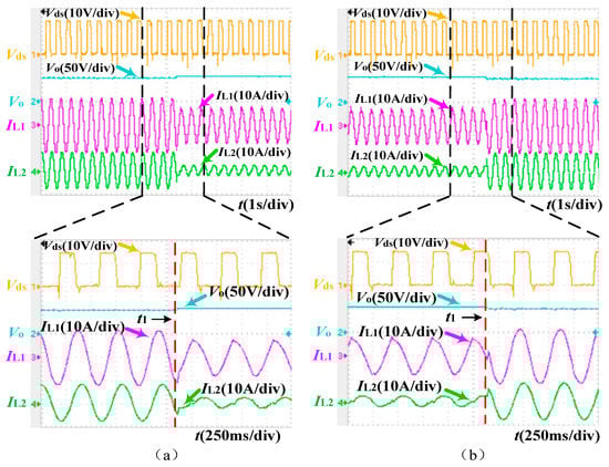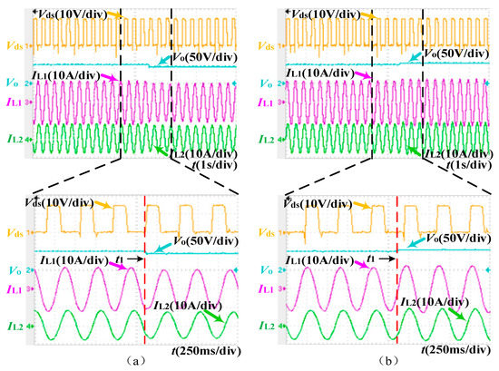 Input and intermediate stage voltage waveforms of each module during load changes suddenly. (a) Input voltage waveform; (b) intermediate stage voltage waveform.
