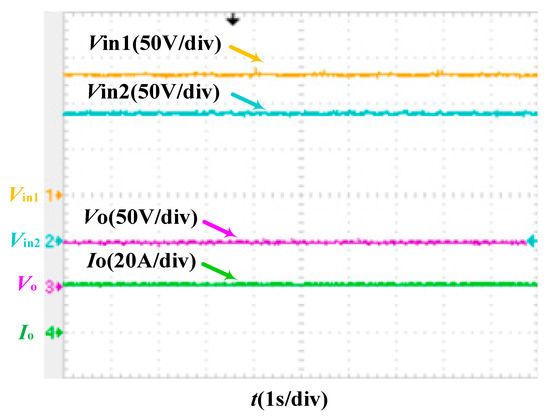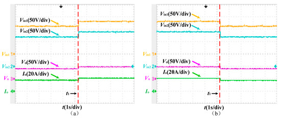 Figure 24a,b show the waveform of the input voltage and system output voltage and current of each module when the output load suddenly changes between 2.304 Ω and 9.216 Ω, respectively. The experimental results show that the input voltage of each module can be considered almost unchanged when the load suddenly changes, and the output voltage is stable at 48 V, which verifies the effectiveness of the control strategy.