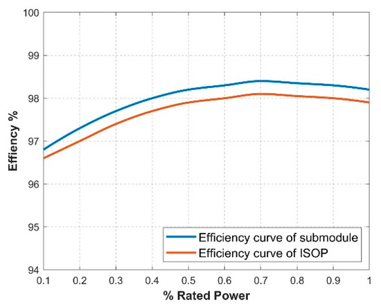 The efficiency curve of the submodule and ISOP system is shown in Figure 26. When the output power is less than the rated power, the efficiency of the submodule and ISOP system tends to increase as the output power increases. However, when the output power reaches about 70–80% of the rated power, the efficiency is the highest, and it will decrease later, but overall, the efficiency is over 96%. In addition, the efficiency of the submodules is better than that of the ISOP system. The comparison of the theoretical and experimental results is shown in Table 2.