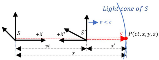 According to theory, the light cone (blue) of frame S contains the worldline of frame S’ inside it (Figure 1). In this case, an event P of light from this cone corresponds to a light pulse that moves in the positive direction of the X axis but in the negative direction of the X’ axis, which is the only difference from the usual thought experiment used to derive the Lorentz transformations. Event P is located on the positive X axis of frame S and corresponds to the negative X’ axis in frame S’.