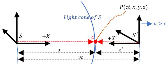 In this case, according to Schwartz [6], the worldline of the tachyonic frame S’ should be located outside the light cone of frame S (Figure 2), since its velocity would be greater (), and therefore it would have traveled a greater distance than that of the light cone ().