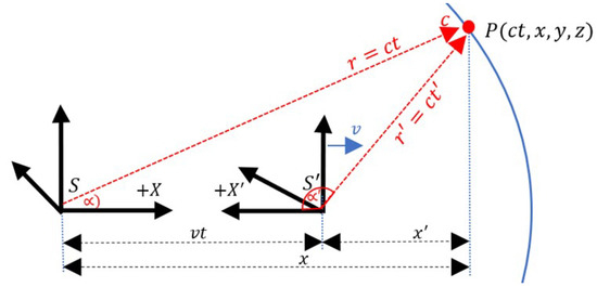 The Lorentz factor (65) yields the same results as the AETF (62), even though the latter depends on the incidence angles of the selected events P. For example, if the velocity of the frame S is and the angle , we can substitute these values into Equations (62), (65), and (68), as shown in Figure 5.