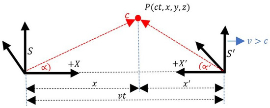 The general case is where the frame S’ has a superluminal velocity, i.e., , and the angle of the trajectory of P does not coincide with the trajectory of S’ (Figure 5). However, if in this case the trajectories were to coincide, then the angles and would be ; therefore, the value of their cosine is equal to 1 in both cases. This situation corresponds to that presented in Figure 2.