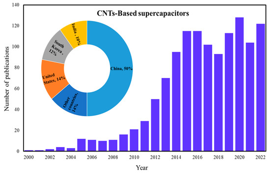 Supercapacitors are capable energy storage systems, as they offer fast charge/discharge, high cycle stability, high power density, and stable electrical properties. Supercapacitors in several industries are used for energy harvesting and high-power systems in electric vehicles. Recently, supercapacitors based on CNTs composite electrodes have received more attention due to the electrical and chemical properties of CNTs [1,2,3,4,5,6,7]. Growth in the publication of CNT-based supercapacitors is shown in Figure 1.