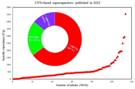 Figure 2 shows the SC of CNT-based supercapacitors that was published in 2022. As shown in Figure 2, 14% of supercapacitors achieved a SC higher than 1000 F/g and 65% lower than 500 F/g.