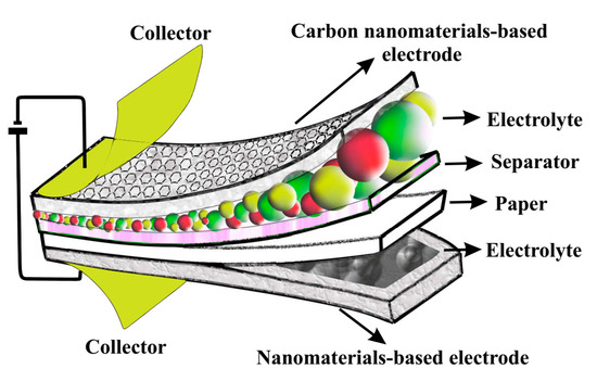 As can be observed in Figure 4, the SC of different publications in 2022 are from 113 F/g to 2532 F/g. Yang et al. [80] reported a supercapacitor with nanocomposite electrodes based on the CNTs/graphene and Ti3C2Tx MXene. They demonstrated that the SC of the supercapacitor at the 3000 mV/s was 349 F/g with a CR of 97.1% after 100,000 cycles. In another study, a supercapacitor based on nanocomposite electrodes with the combination of CNTs, reduced graphene oxide (rGO), and ZrO2 nanoparticles, was investigated [81]. That study demonstrated that the CNT/rGO/ZrO2 nanocomposite electrode offers the SC of 357 F/g at 1A/g with a CR of 97.1% after 5000 cycles, and the structure of CNTs/rGO creates an excellent conductive network. Wang et al. [82] described a flexible supercapacitor with a CNT/rGO electrode and demonstrated a SC of 267.8 F/g. Recently, paper supercapacitors based on the carbon nanomaterials’ electrode and polymer electrolyte were used. Figure 5 shows a schematic of paper-based supercapacitors.