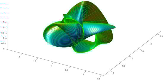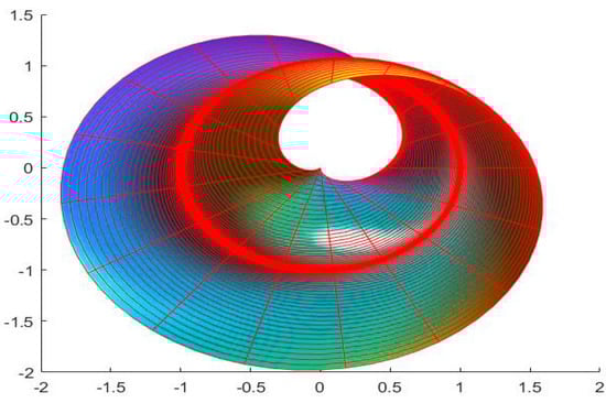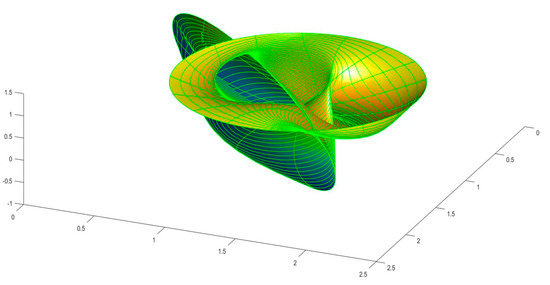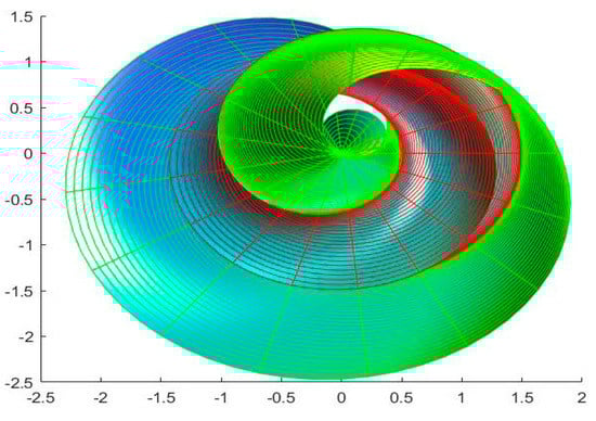 Note that since both rotations must be synchronized, they are expressed using the same parameter . Here, the presence of the factor allows for differences in the rotation speed of both rotations [,]. The coefficients and of the first and second fundamental forms of the twisted surface in the Euclidean 3- space are