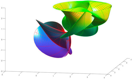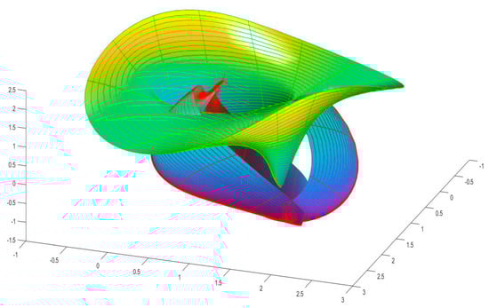 using the anti-symmetric rotation matrix. By rotating (9) about the -axis, the following twisted surface is obtained in Euclidean 3-space.