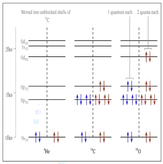 So, what is going wrong? The answer lies in the so-called Wildermuth condition [27], which includes the Pauli exclusion principle (PEP). To illustrate this, we take the system +O →Ne, also using the shell model with its symmetry (remember, it is the three-dimensional harmonic oscillator). All nucleons of the particle are in the s-shell, thus not contributing any oscillation quanta. The O nucleus has four nucleons in the s-shell and twelve in the p-shell. Each nucleon in the s-shell does not contribute to the oscillation number but each in the p-shell contributes 1, i.e., the oxygen nucleus contributes 12 oscillation numbers. In contrast to that, the Ne nucleons have four nucleons in the s-shell, twelve in the p-shell and four in the sd-shell, thus having a 4*0+12*1+4*2=20 oscillation number. Summing the ones from and O gives 12; thus, 8 are missing. Remember that the -particle and the oxygen are in the same mean field (oscillator potential) of the Ne-nucleus. In order to satisfy the PEP, the remaining eight oscillation quanta have to be deposited in the relative motion. This implies that the lowest number of quanta has to be eight. This corresponds to the irrep , identical to the Elliott model.