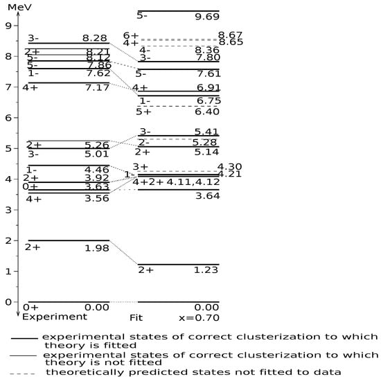This example shows how a pretty powerful mathematical method gives unphysical results, though by choosing the parameters adequately it can describe observation. Including the PEP results in a model that satisfies it and can also adjust the observational spectrum. This is meant as a warning, i.e., saying that “the model describes well the spectrum” does not necessarily imply that it is correct. In fact, there is a cluster model, which takes into account the PEP in the correct manner, also starting with counting the degrees of freedom and constructing the same type of Hamiltonian as the Vibron Model. This is the Semimicroscopic Algebraic Cluster Model (SACM) [24,25] presented in the last section.