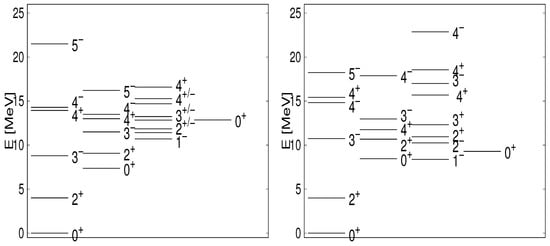 This type of omission is continued in the Algebraic Cluster Model (ACM) [39] applied to C and O [40,41], described in terms of states consisting of three and four -particles, respectively. The relative motions of the -particles are described via Jacobi coordinates. With respect to setting up the degrees of freedom, this model is correct. However, the ACM does not anti-symmetrize between the -particles, though this is of utmost importance at low energy when the overlap of the -particles is significant. In Figure 4 (data are taken from [21]), the calculations of the ACM, in the case of C, is compared to the SACM. The content is given in Table 1, obtained from a microscopic construction. This space is opposed to the one used in the ACM. Considering the available data, both models seem to reproduce measurements. However, the ACM predicts too many states at low energy. For example, the state in the excited band is at too low energy compared to the results obtained within the SACM. In general, the ACM predicts more states at low energy than a model that takes into account the PEP. One may argue that the experiment has to decide; however, here we have another criterion: the PEP. Namely, any model that violates PEP is per definition wrong.