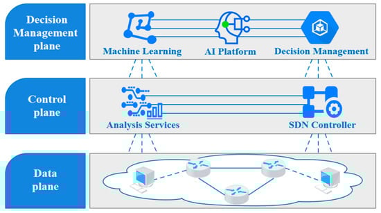 Combining the artificial intelligence method to study the SDN, the knowledge defined network (KDN) architecture is proposed, aiming to obtain network information through the advantage of centralized control of SDN and solve complex network control and management problems using intelligent decision making. The framework is shown in Figure 1. The KDN mainly consists of a data plane, control plane, and decision management plane, aiming to provide automated network control and management for SDN through the closed-loop control. The analysis platform in the control plane monitors the fine-grained traffic information in the data plane in real time and queries the control and management status of the SDN controller to provide a global view, define the network topology, collect and process information provided by network devices, monitor and analyze the network, and ensure the long-term proper configuration and operation of the network. The decision management plane is the core of the KDN. It uses the network view information provided by the control plane analysis platform to learn and generate useful knowledge from the network and is responsible for the generation of dynamic control policies. The data plane consists of several network elements, each of which could contain one or more SDN data paths. Each SDN data path is a logical network device containing three parts: the control data plane interface agent, the forwarding engine table and the processing function, which has no control capability and needs to be controlled by the control plane to forward and process data.