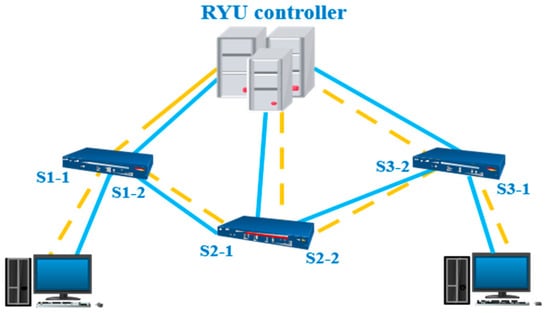 The prototype system starts an Ubuntu 16.04 virtual machine on the computer, starts Mininet in a VMware virtual machine, and sets up a simple network for testing, as shown in Figure 4, which depicts the working principle of SDN. The RYU controller is the controller of SDN, and s1, s2, and s3 are the switches.