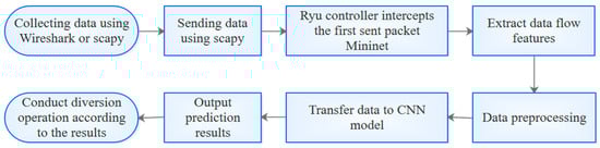 The edge cluster packets are collected and sent to the network, which receives the packets and forwards them to the controller. After the controller receives the data packets, it extracts the corresponding information according to the features and saves them. After data pre-processing, data are transmitted to the pre-trained CNN model, and the prediction results are obtained by the model. The implementation is shown in Figure 5 and the program flow is shown in Figure 6. The impact of abnormal traffic is mitigated by mitigation strategies.