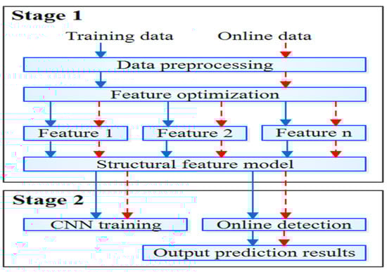 When the network is operating safely, the features of each dimension of the network are relatively stable, but when anomalies occur, there are large fluctuations. When the value of some dimensions exceeds a threshold, it is determined that an anomaly has occurred. There are many types of anomalies, and the different anomalies underlying the CNN anomaly flow detection model have different features. As shown in Figure 7, the specific process of detection is divided into two main stages, Stage1 and Stage2: Stage1 is pre-processing, and the network traffic data are collected using the time window method. The common attack takes a time window of 2 s and collects data once; the slow attack takes a time window of 5s and collects data once [29]; Stage2 is CNN training modeling with real-time anomaly detection and alerting of online data [30].