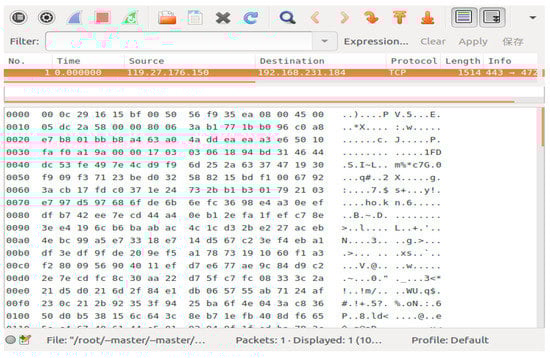 The original traffic packets are used as the analysis object for network anomaly detection, which does not require filtering and design for the traffic features to be extracted. Compared with the commonly used manual traffic packet data extraction methods, this method can retain all feature information of each traffic packet. In Wireshark, in this paper, it can be seen that the original traffic packets are some hexadecimal codes, as shown in Figure 9.