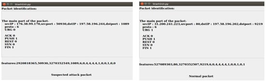 When the controller receives an unknown packet via the OpenFlow protocol, the packet contains complete information about the packet. After the controller receives the packet, it will parse the packet’s encapsulation. That is, it parses each layer of the packet, extracting the information from each layer of the packet layer by layer like peeling an onion. In this way, a flow table can be created for the packet based on the extracted information. Then, the packet-out packet is passed to the exchange board through the OpenFlow protocol. The packet-out packet contains the interface to forward the packet. Based on this principle, the packets submitted by the exchange board can be processed, and then the required information can be extracted and passed to a trained model for identification and prediction, the results of which are shown in Figure 3. Firstly starts the Mininet and RYU controller. And sends packets at this time the switch forwards the first packet to the controller. The controller transmits the packet to the CNN anomaly detection model. After data preprocessing, CNN training and modeling are used to identify the abnormal traffic. If it is normal traffic, the packet is directly transmitted. If abnormal traffic is identified, blocking, redirect, and discard are three ways to mitigate the attack of anomalous traffic.
