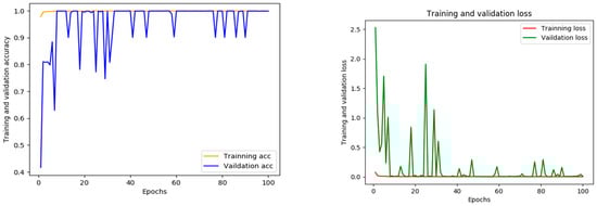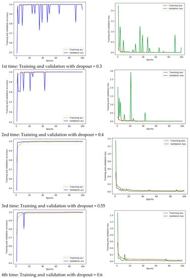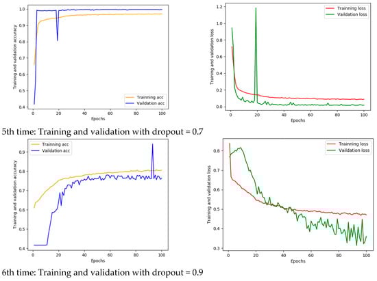 During the training process, the loss values of the model without the dropout technique were smaller than those of the model with the dropout technique. As can be seen from Figure 12, the variation of the values of validation loss and accuracy in the model without the dropout technique is very large. On the contrary, the variation of validation loss and accuracy in the model with the dropout technique is relatively small. Its curve tends to be smooth. When the model is not trained with the dropout technique, the training data are overfitted in order to minimize the loss function. This leads to minimizing the loss of the model. On the other hand, the accuracy of the model with the dropout technique is high. This is because when the parameters are updated, some parameters are randomly selected to be updated in order to avoid the learning record of the inherent model parameters. When testing the model incorporating the dropout technique, the learning parameters of each small network are fully considered. So, the problem of overfitting to individual parameters does not occur. This greatly reduces the overfitting of the model. The above results demonstrate that adding dropout technique will greatly reduce the overfitting and make it perform better in the test dataset.