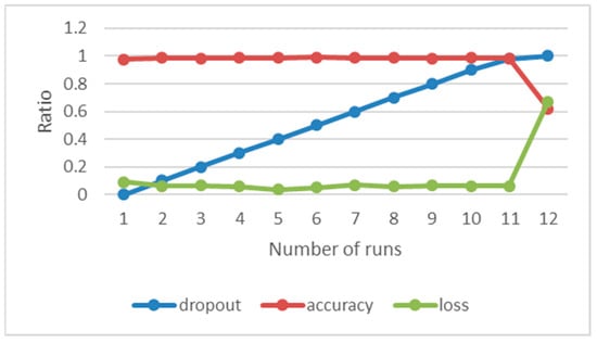 To improve the model generalization ability, the dropout technique was added to deal with the overfitting problem. In the experiments, comparison was made with and without the dropout technique, as shown in Figure 12 and Figure 13. During the model design and testing, the dropout was set to 0.55. The final loss and accuracy of the statistical model tended to be stable.