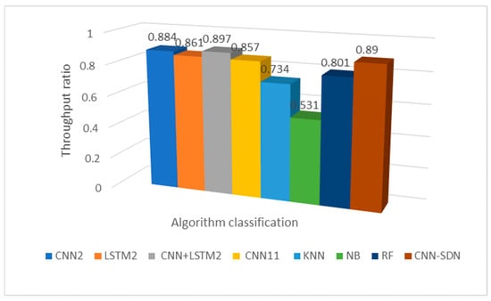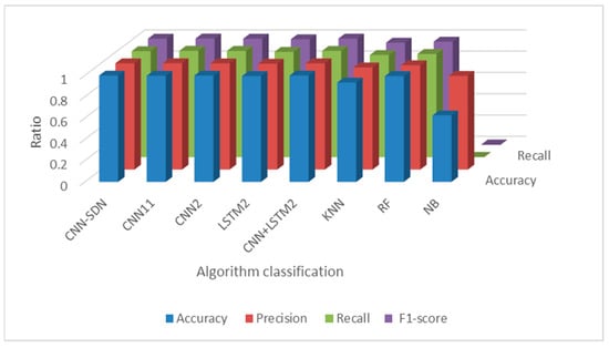 The CNN-SDN model was analyzed based on the original features extracted from the traffic shown in Figure 15. As seen from the results, the CNN-SDN model performs better than the traditional machine learning algorithms KNN, RF and NB models [37], better than Zhang’s single model of CNN11, CNN2 and LSTM2, and close to the hybrid model of CNN + LSTM2 [14,40].