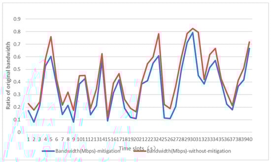 The anomaly detection algorithm detects suspicious traffic and identifies it as DDOS or port scanning or Heart Bleed infiltration. The mitigation module can use three mitigation strategies to handle the anomaly accordingly [5]. The anomaly mitigation module is highly dependent on the attack strength. Here we investigate whether mitigation is used to reduce network bandwidth usage and improve system throughput to measure system operation. These results are shown in Figure 17 and Figure 18. There is a corresponding reduction in bandwidth usage after applying mitigation strategies. Compared to other algorithms, the bandwidth usage of our model is reduced by 8.9% on average and throughput is improved by 10% on average.