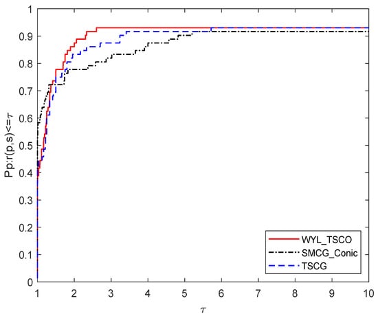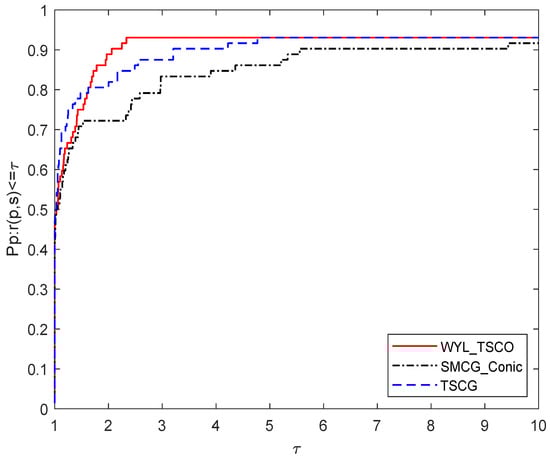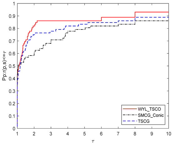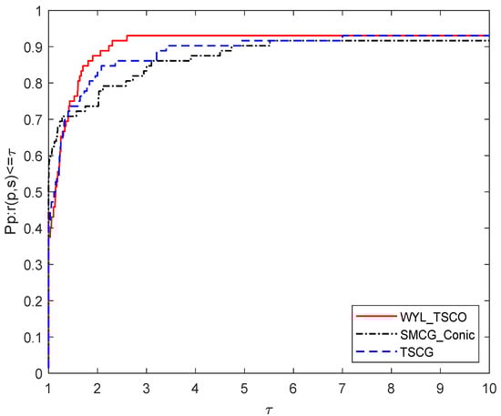 In this section, the results of the numerical experiments are shown below. The unconstrained test functions were taken from [62] with the given initial points. To prove the efficiency of the proposed WYL_TSCO algorithm, we compare its numerical performance with SMCG_Conic and TSCG. The performance profile proposed by Dolan and Moré [63] is used to evaluate the performance of these methods. The dimension of the test functions is 10,000. All the programs were written in C code.