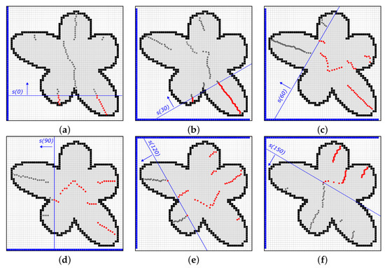 Results of multi-sweeping, when (a), (b), (c), (d), (e), and (f). The frontier cells utilised in the sweeping are coloured in blue.