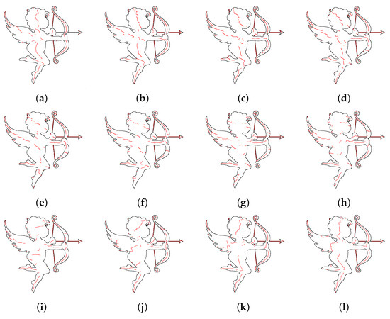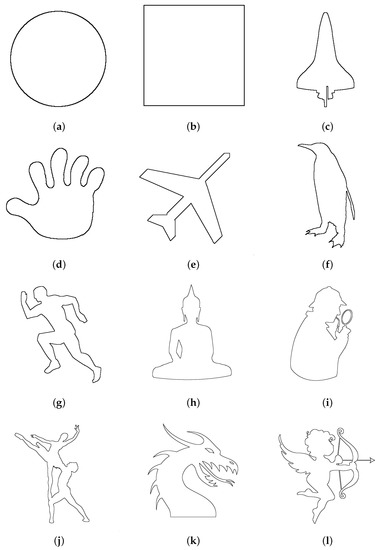 Testing shapes: (a) Circle, (b) Square, (c) Rocket, (d) Hand, (e) Airplane, (f) Penguin, (g) Runner, (h) Buddha, (i) Detective, (j) Ballet, (k) Dragon, (l) Cupid.