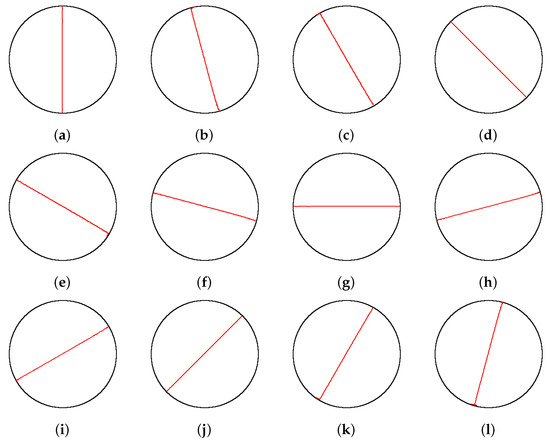 Let be a rasterised plane consisting of equally sized squared cells , , , where n and m define the horizontal and vertical resolutions of . Each cell is associated with an attribute , where I stands for interior, B for border, and E for exterior. Let be a subset of , such that . In addition, let us introduce sweep-line with the slope . investigates by gliding through it. The sweeping is repeated for different slopes ; this is why the method is considered the Multi-Sweep Characterisation Algorithm (MSCA) in the continuation. It works in three main steps:
