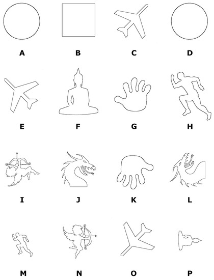 Shapes used for detection of equality; the shapes are denoted by letters (A–P).