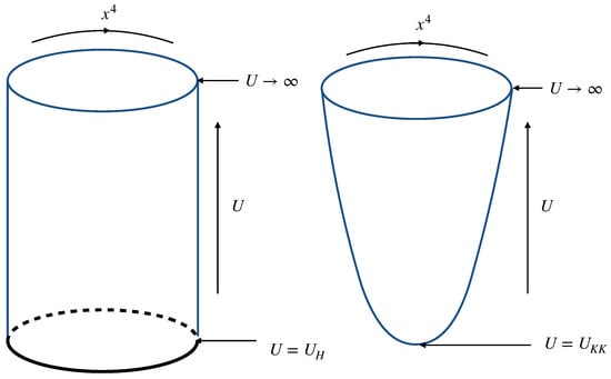 Moreover, as the wrap factor in (16) never goes to zero, the dual theory will be able to exhibit confinement according to the behavior of the Wilson loop in this geometry. Since the solution (16) allows for an arbitrarily large period for , it implies that the dual theory on the D4-brane could be defined at a temperature of zero (or very low). Furthermore, in order to obtain a deconfined version of holographic QCD based on (16) at finite temperature, it is also possible to compactify one spacial direction (denoted by ) of the D4-branes in the background (14) with the antiperiodic condition for the supersymmetric fermions (there might be an issue if we identify the black brane background (14) to the deconfinement phase exactly since Wilson loop on this background may not match to the deconfinement QCD [,]. Nevertheless, we can identify the black brane background (14) to QCD phase at high temperature in which the deconfinement will occur), as is displayed in (17) and Figure 1. In this case, the Hawking temperature T in compactified background (14) is given by (11) as