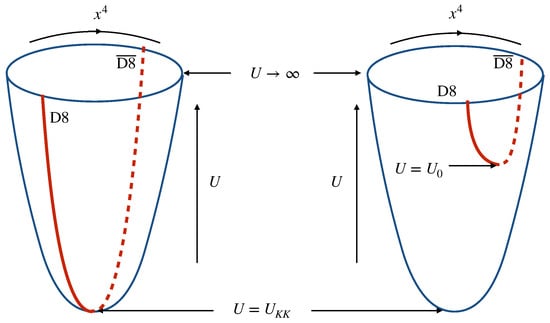 The D8-brane configuration in the black D4-brane background. (Left) D8- and -branes are parallelly located. (Right) D8- and -branes are connected at .