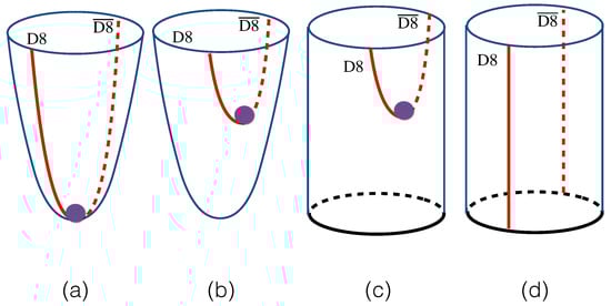 In particular, in the bubble D4-brane background, solution (29) implies and . Thus, is a solution to (29) representing D8- and -branes located at the antipodal points of , while they are connected at , because the size of shrinks to zero at . On the other hand, in the black D4-brane background, if , (30) also implies a constant solution for , while the separation of the D8- and -branes could be arbitrary, but no more than . For , solutions (28) and (29) represent D8- and -branes joined into a single brane at . The configuration of the D8- and -branes in bubble and black D4-brane backgrounds is illustrated in Figure 2 and Figure 3.