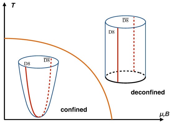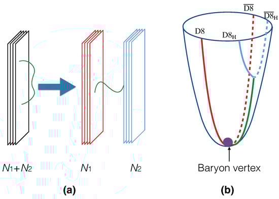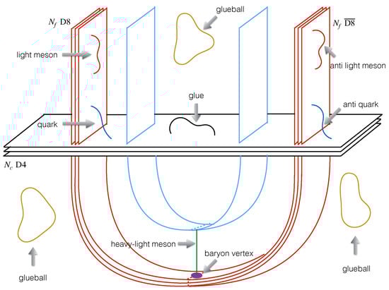 On the other hand, QCD (quantum chromodynamics), as the fundamental theory describing the property of strong interaction, is extremely complex in the strong coupling region, especially at a finite temperature with dense matter, due to its asymptotic freedom [,]; hence, the holographic version of QCD is naturally becoming an interesting topic. While there are several models and theories attempting to give a holographic version of QCD (e.g., bottom-up approaches [,,], the D3/D7 approach [], the D4/D6 approach []), one of the most successful achievements in holography is the D4/D8 model (also called the Witten–Sakai–Sugimoto model) [,,], which includes almost all the elementary features of QCD in a very simple way, e.g., mesons, baryons [,,], glueballs [,,,], deconfinement transition [,,], a chiral phase [,], a heavy flavor [,,], a term and QCD axion [,,,,], and a nucleon interaction [,,,,,,]. The D4/D8 model is based on the holographic duality between the 11-dimensional (11d) M-theory on and the super conformal field theory (SCFT) on M5-branes []. By using the dimensional reduction in [,], it reduces to the correspondence of the pure Yang–Mills theory on D4-branes compactified on a circle and 10d IIA supergravity (SUGRA). Flavors as pairs of D8- and anti-D8-branes () can be further introduced into the geometric background produced by the D4-branes, so the dual theory includes flavored fundamental quarks, which would be more close to the realistic QCD. Moreover, as the D4/D8 model is a T-dualized version of the D3/D9 system [], the fundamental quark and meson in the D4/D8 model can therefore be identified to the 4–8 (The 4–8 string refers to the open string connecting the D4-brane and D8-branes; it is similar for, e.g., the 8–8 or 4– string.) and 8–8 strings, respectively, by following the same discussion in the D3/D9 system []. Moreover, the baryon vertex is identified as a D4-brane wrapped on [], and the glueball is recognized to be the bulk gravitational polarization [,]. The chiral phase is determined by the embedding configuration of the -branes due to the gauge symmetry on their worldvolume [], while the deconfinement transition is suggested to be the Hawking–Page transition in this model [,,,]. Altogether, this model includes all the fundamental elements of QCD; thus, it can be treated as a holographic version of QCD.
