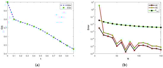 This problem is solved using the proposed method with The absolute error , the relative error , and the error estimates () for various values of N with optimal values of the parameters are shown in Table 1. The plot of the exact solution and numerical solution is shown in Figure 3a. The comparison of , , and () versus N at is shown in Figure 3b. Similarly, the comparison of , , and () versus t with is presented in Figure 3c. From the obtained results, we can see that the method has high accuracy and the computational results are in good agreement with the theoretical results.