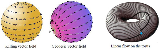 In [24,25] the study of “weak” contact structures on a smooth -dimensional manifold (i.e., the complex structure on the characteristic distribution is replaced with a nonsingular skew-symmetric tensor) was initiated. These structures generalize an f-contact structure and its satellites, and allow a new look at the Riemannian classical theory and find its new applications, for example, to build manifolds with Killing vector fields and totally geodesic foliations, (well known examples are flows on the sphere, linear flow on the torus, see Figure 1), to produce Riemannian manifolds with positive -sectional curvature, and to investigate Einstein-type metrics.
