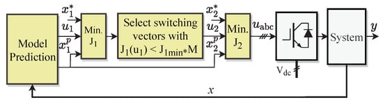 Note that here is the predicted term and is the reference . After the model prediction stage, the first cost function (representing the criterion of highest priority) is executed. The output of block comprises a sorted list of selected optimal voltage vectors that is made available to all subsequent cost function stages to . Stages to each optimize their respective individual cost functions using information about the prediction model and references. The final stage provides the switching signals of the overall optimal voltage vector for each sampling time.