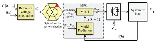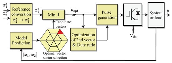 The overall control scheme of a simplified MPC model with unified control objectives is shown in Figure 5 for a generic power converter system. It involves three basic control stages: state prediction, reference conversion, and cost function minimization. Without loss of generality, the figure applies to the case in which two states ( and ) need to be controlled via a single predictive cost function without the use of a weighting factor. Because these states are usually defined in different units, e.g., flux and torque, the crucial step in this method is the reference conversion of both states to the same unit. This can be accomplished by converting one state’s reference to the other (e.g., to , or vice-versa), as was the case in [,,,,,,] for torque to flux reference conversion and [,] for flux to torque reference conversion. Alternatively, a third variable can be introduced, and references and can both be converted to , as was the case in [] for flux and torque to voltage reference conversions. For improved steady-state performance, modifications to Figure 5 can include two optimal switching vectors per cycle instead of one. To achieve this, two stages can be added for second vector selection, duty ratio optimization, and pulse generation control (Figure 6) [].