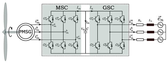 Figure 9 illustrates the system to be controlled. It comprises a machine-side converter (MSC) that functions as an active front-end rectifier connected to a DC-link capacitor, which supplies a grid-side converter (GSC). For greater modeling simplicity, the wind turbine is directly mounted on the PMSG shaft without any interfacing gearbox. The system parameters are provided in Table 2. In order to remain within the scope of this paper, the details of the mathematical models and state predictions for the MSC and GSC can be found in [,] and are not repeated here.